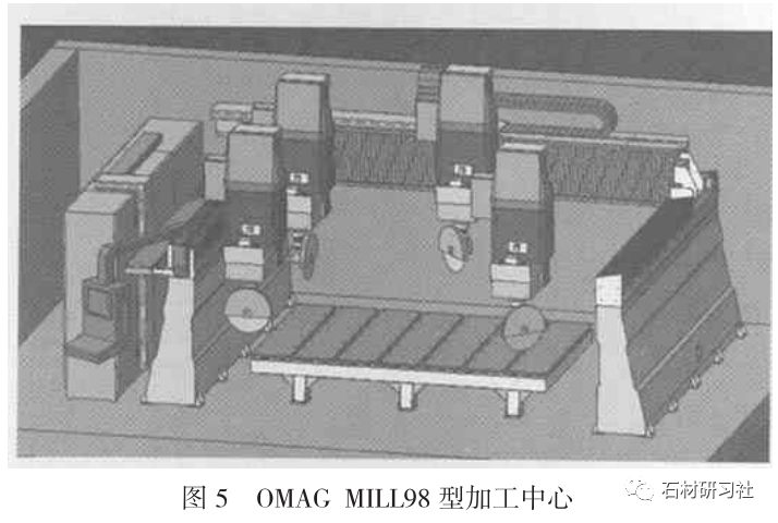 由于有關(guān)技術(shù)和關(guān)鍵的問題還未得到完全徹底解決,故在國內(nèi)石材加工中還沒得到廣泛應(yīng)用,也顯著提高了石材制品的加工效率。圖5為意大利OMAG公司的MILL98型加工中心工作模擬圖,該加工中心同時(shí)配備了4個(gè)工作頭。