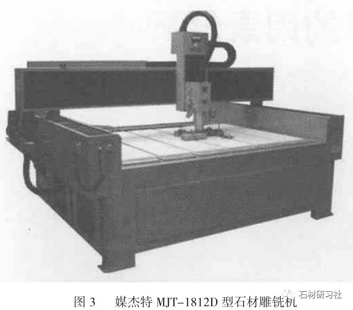 圖3為國產(chǎn)美杰特MJT-1812D型石材雕銑機(jī)主 要用于墓碑加工,其最大加工尺寸為:寬2700mm、 長2100mm、高1800mm,最大加工質(zhì)量為: 1500kg。