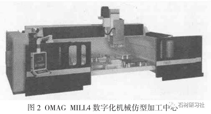 圖2為意大利0MAG公 司MLL4型3到6軸的數(shù)字化機(jī)械仿型加工中心, 這套加工中心集鋸、雕刻、打磨、轉(zhuǎn)銑于一體。